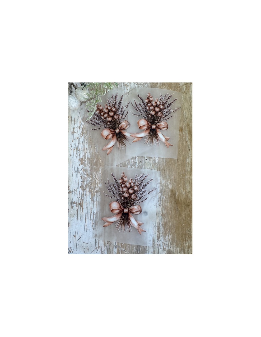 Transfer de aproximadamente 7 x 7 cm (medida orientativa), con un delicado ramo de lavanda combinado con bayas empolvadas y un gran lazo en tonos suaves rosados.
